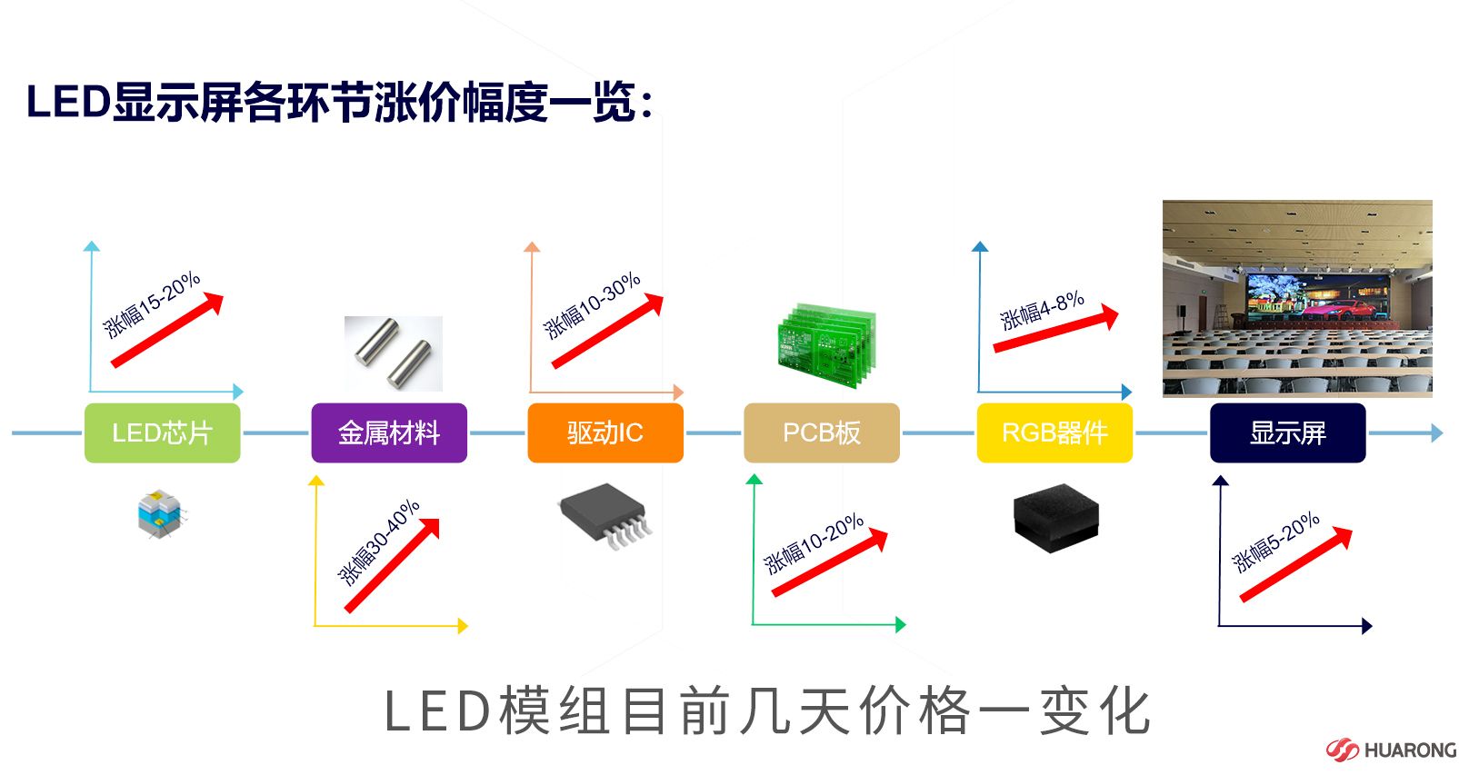 從LED顯示產(chǎn)品產(chǎn)業(yè)的漲價幅度來看,芯片漲幅為15-20%,金屬材料漲幅為30-40%,PCB板漲幅為10-20%,RGB器件漲幅為4-8%,驅(qū)動IC漲幅為10-30%。且因市場動態(tài)發(fā)展,相關(guān)漲價幅度也隨之變化。